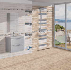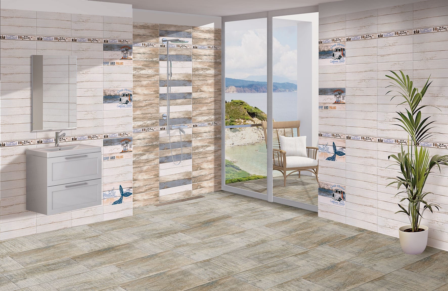 Cu CESAROM® Marina poți amenaja o baie modernă într-un stil neconvențional. Colecția propune plăci cu aspect de lemn nefinisat și decoruri digitale moderne cu temă marină și aer de vacanță.
