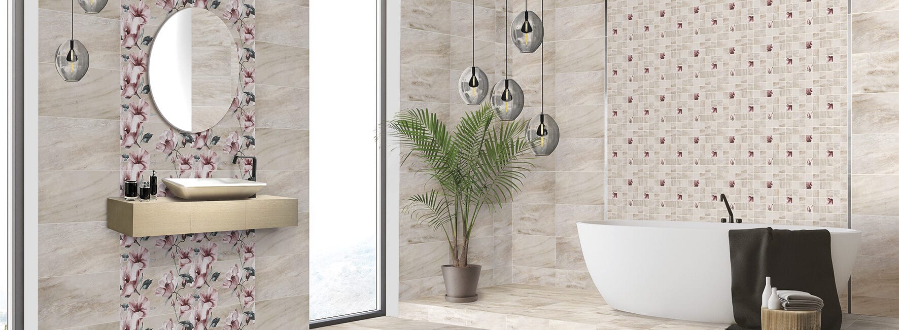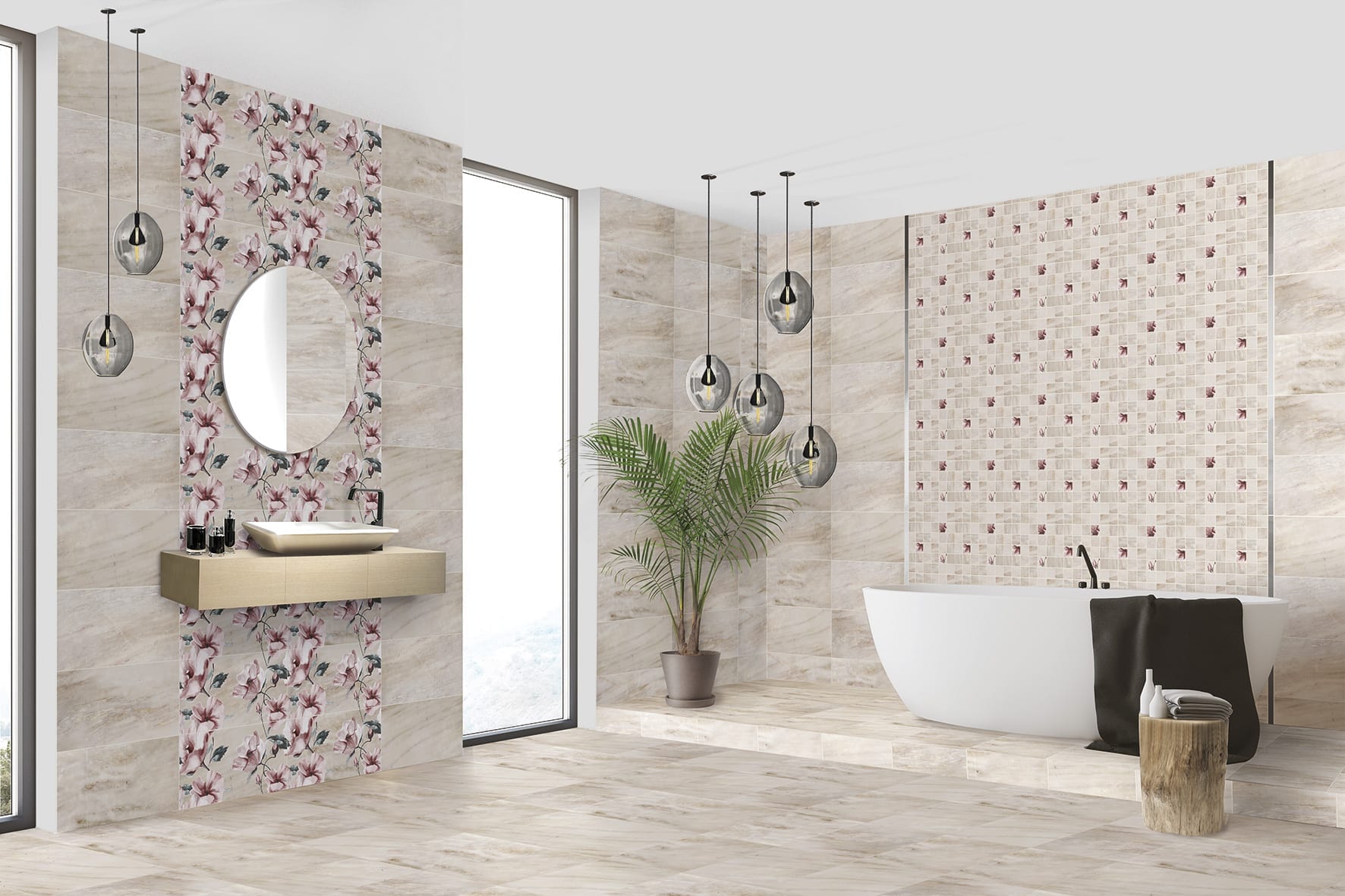 Nuanțele calde de bej și plăcile lucioase cu design marmorat caracterizează CESAROM® Soft, o colecție de gresie și faianță care propune atât plăci simple cât și plăci cu structură, decoruri de faianță cu modele geometrice și florale, completate cu mozaicuri elegante.