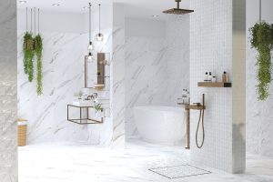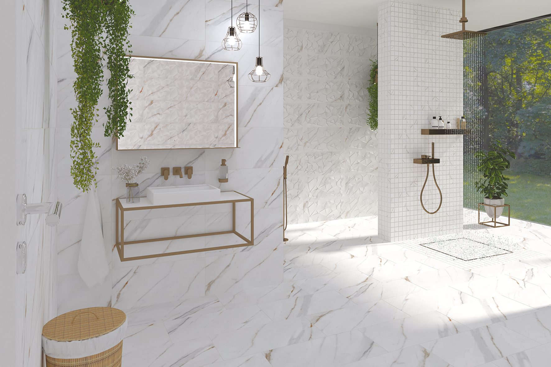 Colecția CESAROM® Statuario transpune în stil modern eleganța și rafinamentul marmurei italiene Calacatta. Cu ajutorul mozaicului porțelanat, colecția Statuario devine sursa funcțională și estetică a oricărei băi și face posibil succesul proiectelor de amenajare a suprafețelor în pantă și siguranța anti-alunecare. O colecție complexă cu plăci de faianță 50×25 lucioase și plăci de gresie porțelanată 60×30 mate, cu suprafețe în relief și netede, cu mozaic de faianță tip herringbone și decoruri floral și geometric cu aplicație aur care inspiră în amenajări pline de eleganță și noblețe.
