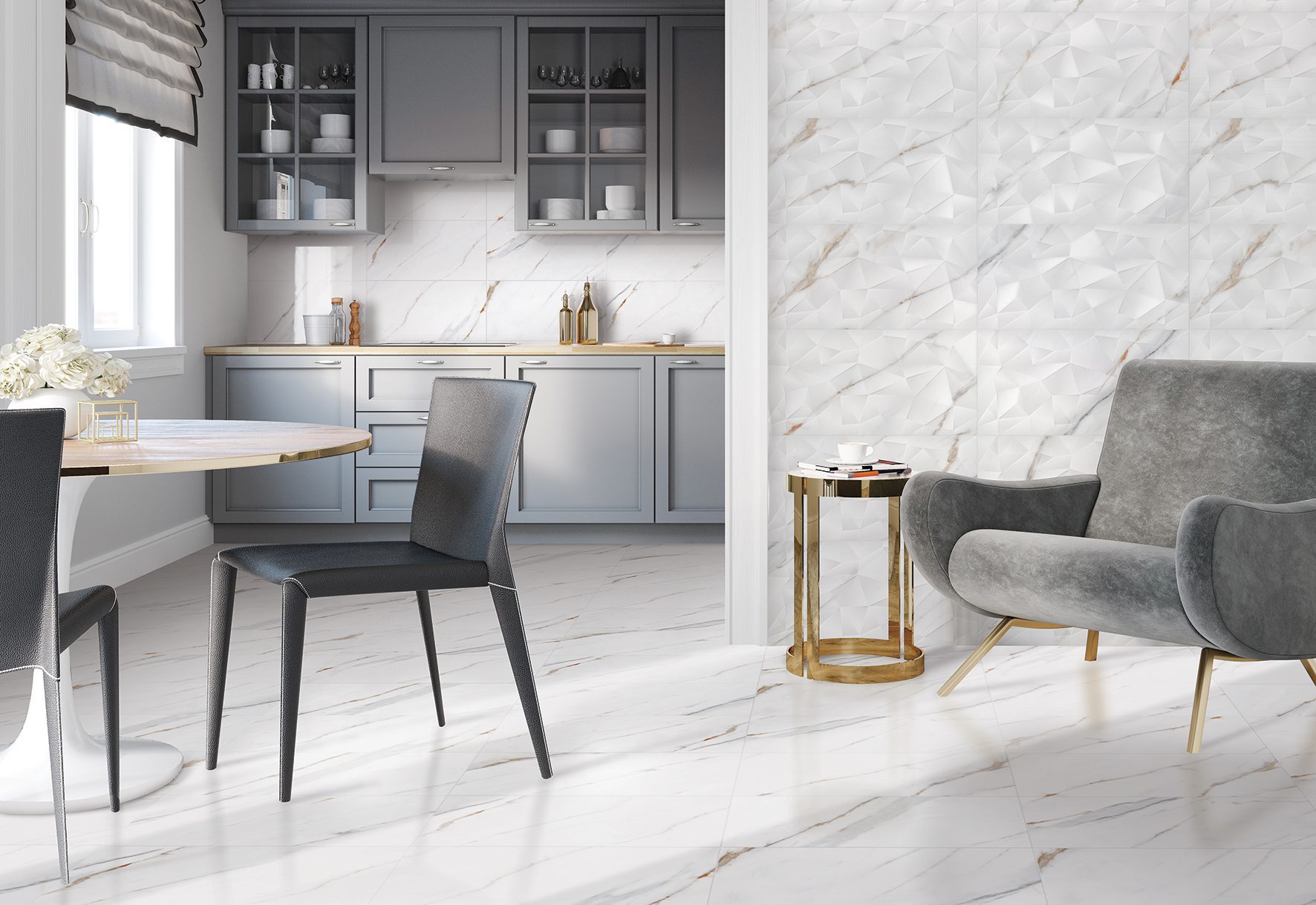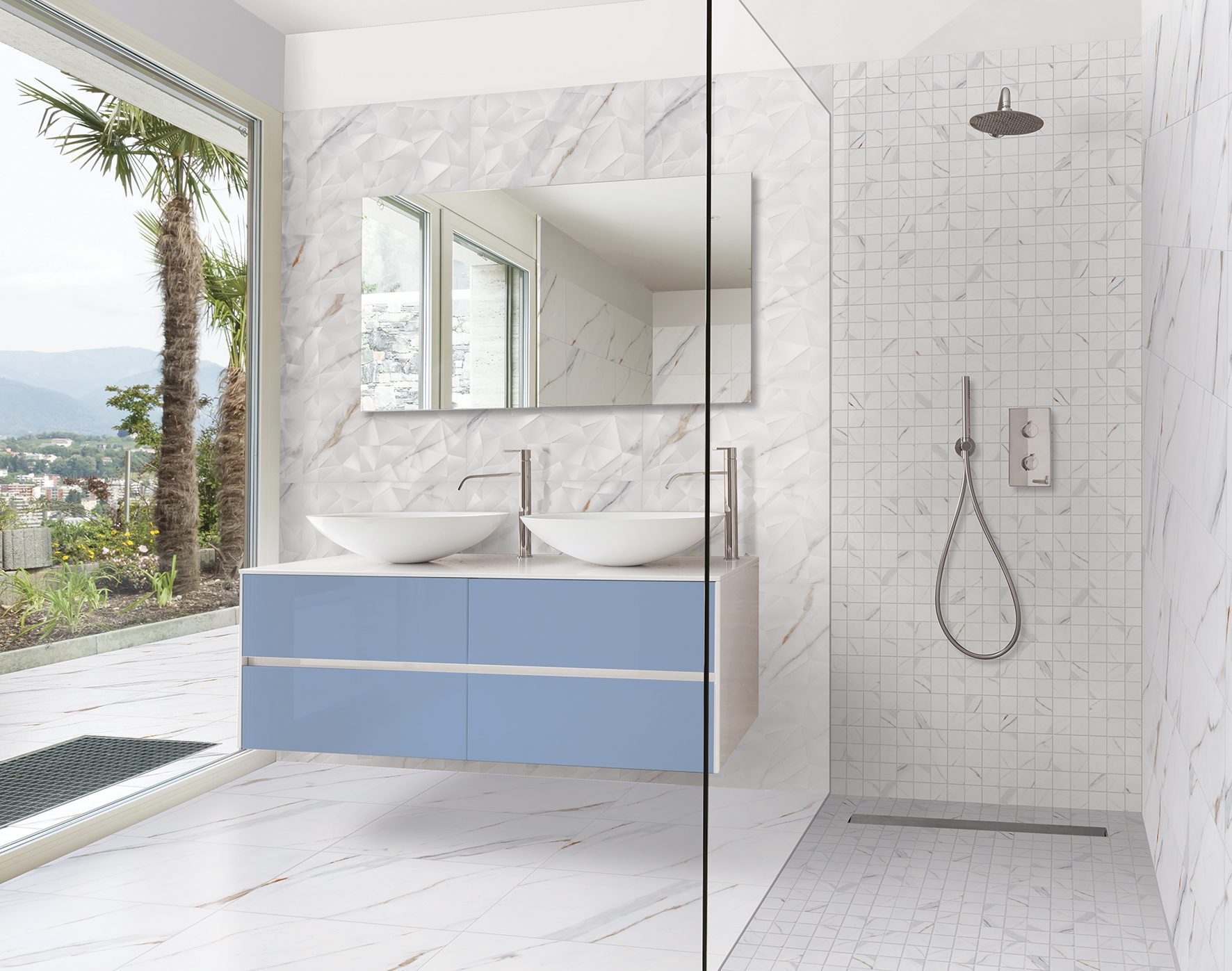 Colecția CESAROM® Statuario transpune în stil modern eleganța și rafinamentul marmurei italiene Calacatta. Cu ajutorul mozaicului porțelanat, colecția Statuario devine sursa funcțională și estetică a oricărei băi și face posibil succesul proiectelor de amenajare a suprafețelor în pantă și siguranța anti-alunecare. O colecție complexă cu plăci de faianță 50×25 lucioase și plăci de gresie porțelanată 60×30 mate, cu suprafețe în relief și netede, cu mozaic de faianță tip herringbone și decoruri floral și geometric cu aplicație aur care inspiră în amenajări pline de eleganță și noblețe.